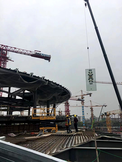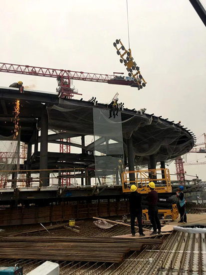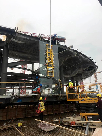 由于玻璃长、大、重,施工时一般采用机械化施工方式,即在叉车上安装电动真空吸盘将玻璃吸附到位,操作人员站在玻璃上端两侧搭设的脚手架上,用夹紧装置将玻璃上端固定,每块玻璃用硅胶填缝。